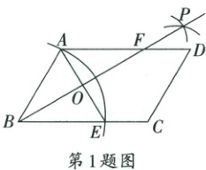 1. (2023·山西)如图,在$□ ABCD$中,$\angle D = 60^{\circ}$.以点$B$为圆心,以$BA$的长为半径作弧交边$BC$于点$E$,连接$AE$.分别以点$A$,$E$为圆心,以大于$\frac{1}{2}AE$的长为半径作弧,两弧交于点$P$,作射线$BP$交$AE$于点$O$,交边$AD$于点$F$,则$\frac{OF}{OE}$的值为