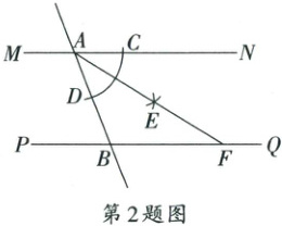 2. (2018·山西)如图,直线$MN// PQ$,直线$AB$分别与$MN$,$PQ$相交于点$A$,$B$.小宇同学利用尺规按以下步骤作图:①以点$A$为圆心,以任意长为半径作弧交$AN$于点$C$,交$AB$于点$D$;②分别以$C$,$D$为圆心,以大于$\frac{1}{2}CD$长为半径作弧,两弧在$\angle NAB$内交于点$E$;③作射线$AE$交$PQ$于点$F$.若$AB = 2$,$\angle ABP = 60^{\circ}$,则线段$AF$的长为