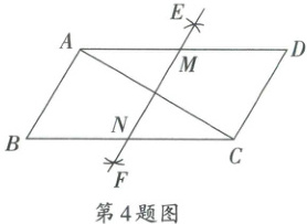 4. (2025·黑龙江齐齐哈尔)如图,在$□ ABCD$中,$BC = 2AB = 8$,连接$AC$,分别以点$A$,$C$为圆心,大于$\frac{1}{2}AC$的长为半径作弧,两弧交于点$E$,$F$,作直线$EF$,交$AD$于点$M$,交$BC$于点$N$,若点$N$恰为$BC$的中点,则$AC$的长为