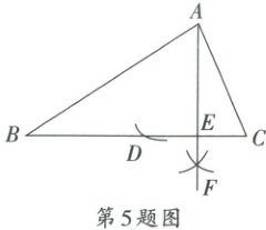 5. (2025·四川广安)如图,在$\triangle ABC$中,按以下步骤作图:(1)以点$A$为圆心,$AC$的长为半径画弧,交$BC$于点$D$;(2)分别以点$C$和点$D$为圆心,大于$\frac{1}{2}CD$的长为半径画弧,两弧相交于点$F$;(3)画射线$AF$交$BC$于点$E$.若$\angle C = 2\angle B$,$BC = 23$,$BD = 13$,则$AE$的长为