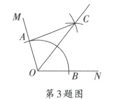 3. 如图,$\angle MON = 100^{\circ}$,点$A$在射线$OM$上,以点$O$为圆心,$OA$长为半径画弧,交射线$ON$于点$B$.若分别以点$A$,$B$为圆心,$AB$长为半径画弧,两弧在$\angle MON$内部交于点$C$,连接$AC$,则$\angle OAC$的度数为(