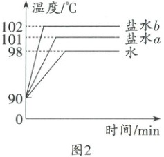 ③小华根据实验获取的数据绘制了如图2所示的液体温度随时间变化的图像,对比盐水a、b的沸点,可以提出新的猜想:________________。实验中小华又继续加热一段时间后(盐水中无晶体析出),发现只有给水加热的实验中温度计的示数保持不变,而给盐水加热的两组实验中,盐水沸腾后温度计示数略有上升,结合图像分析,你认为导致盐水温度略有上升的原因可能是________________。