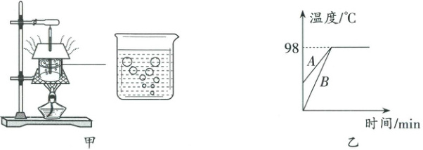 (3)小兰和小伟根据各自的实验数据绘制出水温随时间变化的图像分别如图乙中A、B所示。由图像可知,小兰和小伟所用水的质量大小关系是$m_{A}$ $m_{B}$。