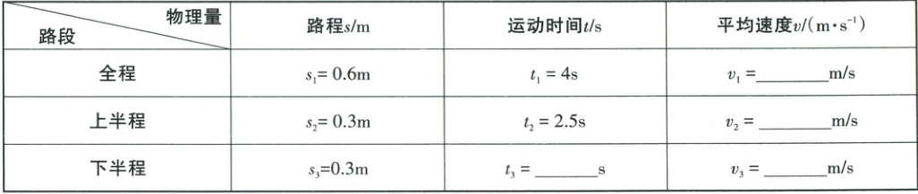 ⑥根据以上实验数据,计算出小车通过下半段$BC$的路程$s_{3}$,所用时间$t_{3}$,下半段的平均速度$v_{3}$。