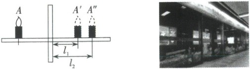 (16)完成实验后,采用厚玻璃板做实验,发现$A$蜡烛在玻璃板上有两个像,移动未点燃的蜡烛分别找到两个像的位置如图中$A'$、$A''$所示,测得两个像到玻璃板右侧那个面的距离$l_{1}=1cm$、$l_{2}=1.4cm$,由此可知,玻璃板的厚度为______$cm$。