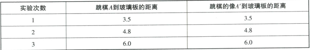 (9)用跳棋代替蜡烛进行实验,改变跳棋$A$的位置,重复以上实验,并分别测出跳棋$A$和跳棋的像$A'$到玻璃板的距离,记录在下表中。