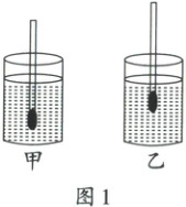 10. (密度计)物理兴趣小组的同学制作了一个简易密度计,分别放入盛有甲、乙两种密度不同液体的两个容器中,密度计静止时,两个容器中液面相平,如图1所示,密度计在甲、乙两种液体中受到浮力 $ F_{甲} $____$ F_{乙} $,甲、乙两种液体的密度 $ \rho_{甲} $____$ \rho_{乙} $,甲、乙两种液体对容器底的压强 $ p_{甲} $____$ p_{乙} $,密度计排开甲、乙两种液体的质量 $ m_{甲} $____$ m_{乙} $。(均选填“$ < $”“$ = $”或“$ > $”)