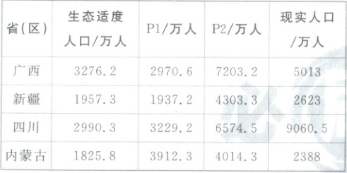 [湖南长沙一中 2025 高一期中]生态适度人口,是指从维护生态系统稳定和保证自然资源可持续利用角度来考虑区域的适度人口规模。依据资源、环境状况,有学者提出了广西、新疆、四川、内蒙古四省(区)生态适度人口数据(下表)。据此完成下面小题。