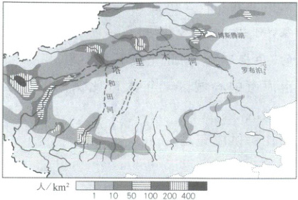 (1)分布不均匀(不均衡);主要沿河流和山麓绿洲分布。(4分)