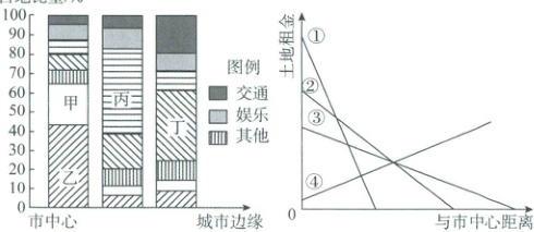 3.C 【解析】本题考查城市的功能分区。读图可知,乙在靠近市中心区域所占比重最大,为商业用地;丁在靠近城市边缘区域所占比重最大,为工业用地;而丙在市中心和城市边缘的中间地带所占比重最大,为居住用地,该区域既方便购物又方便工人上下班。甲在靠近市中心区域占地比重较大,不是工业用地,因此不是工业污染最严重的土地利用类型,A错误;乙为商业用地,地租较高,B错误;丙是居住用地,是城市中分布最广泛的土地利用类型,C正确;丁为工业用地,多分布于城市外围,而不是城市中心区,D错误。