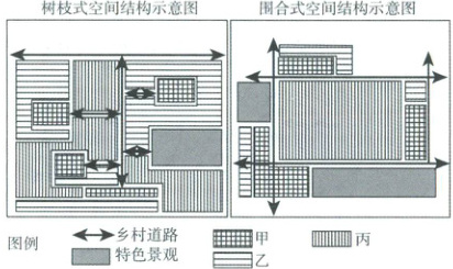 2.D 【解析】本题考查不同乡村空间结构的特点。相比围合式空间结构,树枝式空间结构农田更分散,A错误;道路系统布局方式有差异,但均较为完善,B错误;生活景观主要通过院落判断,相比围合式,树枝式院落更分散,面积并不大,并未明显突出生活景观,C错误;与围合式空间结构相比,树枝式空间结构最突出的特点是林地占比较大,合围在院落周边,突出自然景观,D正确。