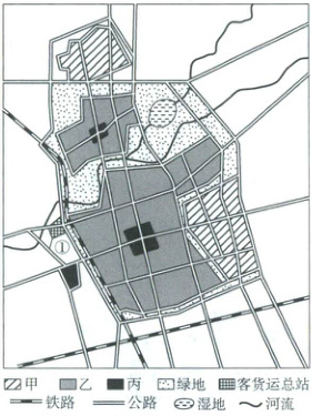 5.D 【解析】本题考查城市功能分区。城区规划的过程中需要适当保留一定规模的绿地和河湖等生态涵养空间,起到净化空气、美化环境的作用,A错误;根据所学知识分析,甲、乙、丙功能区依次是工业区、居住区、商业区,地租随着与市中心距离变近而依次升高,B错误,D正确;该城区总体规划较为合理,故盛行风不可能是自工业区方向吹来的东南风,C错误。