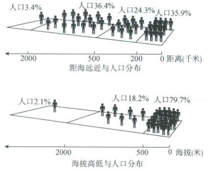 1.C【解析】本题考查读图分析能力。读图可知,距海500千米以内的人口占比为35.9%+24.3%,约为60%,A错误;分布在海拔2000米以上的人口占总人口的2.1%,B错误;近80%的人口分布在海拔500米以下的区域,C正确;大部分人口分布在距海500千米以内的区域,D错误。