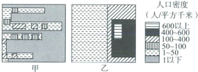 关键点:根据图示人口密度大小和分布可以分析出甲、乙两地的人口分布特点
