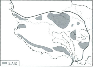 [黑龙江哈尔滨一中2025高一月考]“无人区”是指长期闲置的土地或不适合人类居住的地区。中国有四大无人区——青海的可可西里、西藏北部的羌塘、新疆高耸壮丽的阿尔金和遍地荒漠的罗布泊。研究表明,青藏高原独特的地理环境限制了人口的自然分布与有序发展,居民点集中分布在藏南谷地和川藏高山峡谷区等区域,形成了我国面积广大的“无人区”。下图为青藏高原无人区分布图。据此完成下面小题。