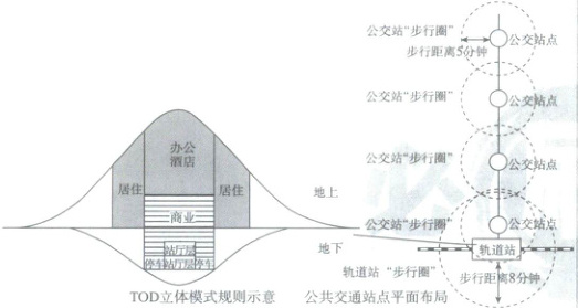 知识拓展TOD模式是以公共交通为导向的发展模式。其中的公共交通主要是指火车站、机场、地铁、轻轨等轨道交通及公交车干线,然后以公交站点为中心、以400~800米(5~10分钟步行路程)为半径建立中心广场或城市中心,其特点在于集办公、商业、文化、教育、居住等于一身的“混合用途”,使居民和雇员在不排斥小汽车的同时能方便地选用公共交通工具、自行车、步行等多种出行方式。城市重建地块、填充地块和新开发土地均可以TOD的理念来建造,TOD的主要方式是通过土地使用和交通政策来协调城市发展过程中产生的交通拥堵和用地不足的问题。