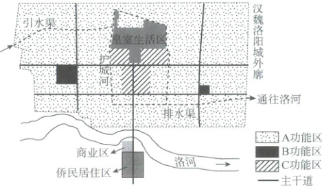 洛阳因位于洛河北岸而得名,其历史悠久,被誉为“十三朝古都”。下图示意汉魏时期都城洛阳的城市功能分区,主要有皇室生活区、行政办公区、居住区、商业区、侨民居住区五种。