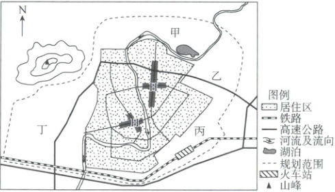 2.C【解析】本题考查城市功能区的分布。大型工业园区占地面积较大,同时由于原料和产品需要运输,对交通的依赖性较大,适合分布在郊区交通便利的地方。工业区可能会有一定的污染,应布局在盛行风的下风向(该地常年盛行北风,因此工业区应布局在城市南部)。读图可知,四地中,丙位于郊区,靠近火车站,且位于城市偏南部,是最适合的选址位置,C正确;甲、乙位于城市的偏北方,为盛行风的上风向,不适合布局工业区,A、B错误;丁距离火车站较远,交通相对不便利,D错误。