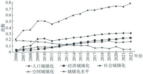 (1)城镇化水平总体上升;人口城镇化、经济城镇化、社会城镇化水平上升,空间城镇化水平降低;2022年人口城镇化水平最高,空间城镇化水平最低。(6分)