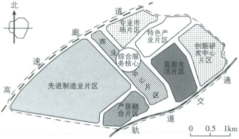 [浙江 2025 年 6 月·17]产城融合是指产业与城市融合发展。下图为某城市新工业园区空间结构规划图,该园区致力于打造创新服务、低碳宜居的产城融合新区。据此完成下题。
