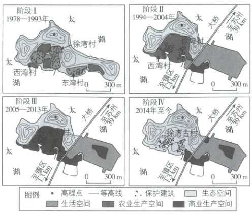 叶山岛位于太湖东南水域,南宋末年就有村民在该岛定居;至清代,岛上居民已达百余家,村民以渔、农为业,皆会唱曲。20 世纪 90 年代以来,随着该岛被纳入太湖国家旅游度假区以及徐湾古村被列入苏州市第一批传统乡村名录,当地居民的生活、生产空间发生了显著改变。近年来,当地政府利用古村落和传统戏剧文化资源发展文旅产业,下图示意 1978 年以来叶山岛生活、生产和生态空间的变化过程。