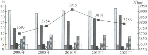 [广东茂名七校联盟2024高一联考]受经济、政策、资源等多种因素影响,近20年来黄淮海地区农作物播种面积大体在3600万~4000万hm²。下图是2000—2021年黄淮海地区农作物播种面积及结构变化图。据此完成下面小题。