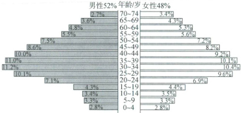注:此处 75 岁以上的年龄组(男性占 4.1%,女性占 5.8%)被省略。