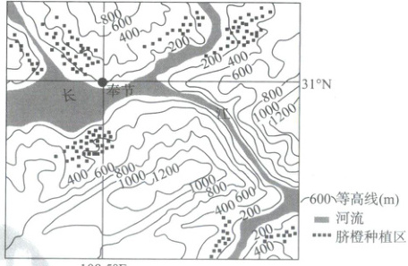 6.D 【解析】本题考查农业区位因素。据图可知,脐橙主要分布在河流附近海拔较低的缓坡地带,坡地排水状况良好,低海拔处热量条件较好,因此可以推测,脐橙的习性有不耐涝、不耐寒,③④正确;脐橙在阴坡和阳坡都有分布,②错误;脐橙在迎风坡和背风坡都有分布,①错误。故选D。