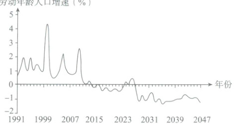 [河南信阳高级中学 2024 高一月考]人口机会窗口期是人口年龄结构有利于经济发展、劳动力供给充足、人口抚养负担相对较轻的一段时期。下图为我国 1991—2047 年劳动年龄人口增速变化图(含预测)。面对我国劳动年龄人口变化形势,较发达城市正在积极实施“积分入户”政策,“积分入户”指外来人口取得政策规定分值后即可申请落户,是迁入地促进外来人口融入的有效方式。据此完成下面小题。