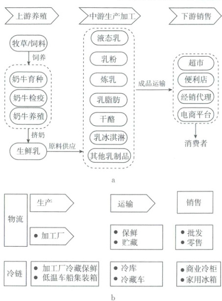 Y 乳业公司是华东地区首屈一指的乳制品集团,形成了独具特色的一体化全产业链。公司高度重视奶源基地建设,在省内拥有多家远离城市的大型牧场,拥有自己的规模化专业冷链运输车队。牛奶挤出后会快速制冷并在当天交售到工厂进行加工生产,产品之一的低温奶储存运输全程冷链,温控要求严格,深受消费者喜爱。近几年 Y 乳业公司借助新兴网络社交平台,开展多场景多维度的营销,电商渠道低温奶的销量增长快速。图 a 示意 Y 乳业公司全产业链,图 b 示意冷链物流产业链。