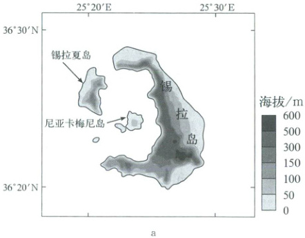 [山东 2024·11~12]锡拉岛位于地中海,整个岛屿被厚厚的火山岩和火山灰覆盖,夏季岛上北风频发。约 3600 年前的古锡拉岛是一个圆形的大岛(范围包括现在的锡拉岛和附近小岛,以及这些岛屿之间的海域),后来演变成环形群岛,其中最大的岛屿为锡拉岛(图 a)。锡拉岛的西部葡萄种植历史悠久,当地农民在管理葡萄时将葡萄藤盘成圆形的篮子状(图 b),并将葡萄果实置于“篮子”内生长。据此完成下面小题。