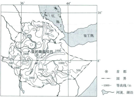 (1)本题考查埃塞俄比亚发展灌溉农业的水资源条件和地形条件。读埃塞俄比亚地形图可以推知该国地形条件以高原山地为主,地势起伏大,据此可以得出土地坡度大,不利于灌溉的结论。结合区域地理背景知识,特别是区域气候类型可知,埃塞俄比亚以热带草原气候、高原山地气候为主。因此,其水资源条件为大部分地区降水较多,但季节分配不均(6—8月为雨季)。同时,结合地形图,可以推知该国河湖多,地表水资源较丰(东非水塔),但空间分布不均。