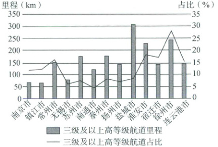 [河北邢台2025高一月考]在内河航运中,三级以上河道可通行船舶吨位较大,河运价值较高。江苏省受独特地理格局的影响,内河运输量较大,内河运输发达,但各地级市内河运输条件差异较大。下图为2020年江苏全省地级市三级及以上高等级航道情况图。据此完成下面小题。
