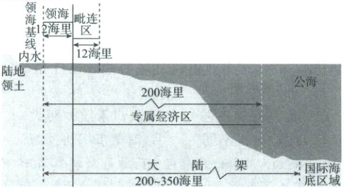 教材变式[广西北海 2025 高一期末]《联合国海洋法公约》所建立的海洋法律制度,第一次对海洋权益进行了全面而系统的规定,使各国开发和利用海洋走上了规范化道路。下图为主权国家管辖海域的划分图(1 海里 = 1852 米)。据此完成下面小题。