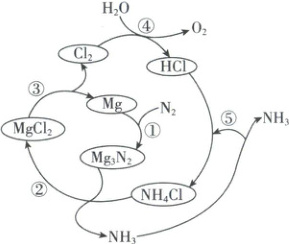 1.B [解析]反应①是氮气和镁化合生成氮化镁,N由游离态转化为化合态,属于人工固氮,A正确;反应②是氮化镁和氯化铵反应生成氯化镁和氨气,各元素的化合价均不变,属于非氧化还原反应,B错误;反应⑤是氨气和氯化氢反应生成氯化铵,在无水环境中进行时,有白烟产生,C正确;根据题图可判断该转化过程中总反应的反应物是$\mathrm{N_2}$和$\mathrm{H_2O}$,产物是$\mathrm{NH_3}$和$\mathrm{O_2}$,D正确。