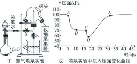 (5) 某小组用传感技术测定喷泉实验中的压强变化来认识喷泉实验的原理。引发喷泉实验,电脑绘制三颈烧瓶内压强变化曲线如图戊所示。图戊中