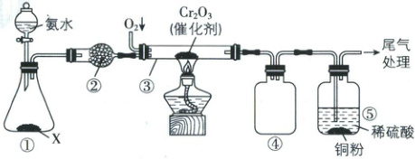 思路导引装置①中氨水与固体X反应制备氨气,装置②中碱石灰干燥氨气,装置③中氨气在催化剂作用下与氧气发生催化氧化反应生成一氧化氮,装置④中反应生成的$\mathrm{NO}$与过量的$\mathrm{O_2}$反应生成红棕色气体$\mathrm{NO_2}$,$\mathrm{NO_2}$与反应生成的及⑤中逸出的水蒸气反应生成硝酸,硝酸与氨气反应生成硝酸铵,会有白烟产生,装置⑤中氮的氧化物与氧气溶于水反应生成硝酸,硝酸根离子、氢离子与铜反应生成蓝色的铜离子。