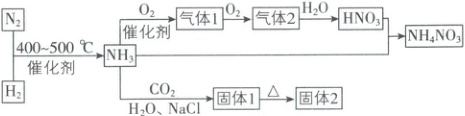 思路导引 由题图可知,N₂和H₂在催化剂、400~500℃条件下反应生成NH₃,氨气和氧气在催化剂条件下反应生成气体1,气体1和氧气反应生成气体2,气体2与水反应生成HNO₃,则气体1为NO,气体2为NO₂,HNO₃与NH₃反应生成NH₄NO₃;向饱和氨盐水中通入二氧化碳生成溶解度较小的碳酸氢钠晶体,故固体1为NaHCO₃,NaHCO₃受热分解生成的固体2为Na₂CO₃。