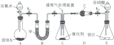 5.B 【解析】装置A中浓氨水与碱石灰(或氧化钙)反应制备氨气,装置B中盛有的碱石灰用于干燥氨气;装置E中浓硝酸与铜反应制备二氧化氮,装置D中盛有的五氧化二磷或硅胶用于干燥二氧化氮,装置C中氨气与二氧化氮在催化剂作用下反应生成氮气和水。固体X为碱石灰、氧化钙或氢氧化钠固体均可,A正确;氨气会和无水氯化钙反应生成氨合物,因此甲试剂不能为无水氯化钙,B错误;二氧化氮的密度比空气大,所以实验时先通入二氧化氮排尽装置中的空气,有利于氨气充分与二氧化氮反应,减少空气对实验的干扰,C正确;装置C中反应为8NH₃+6NO₂$\stackrel{催化剂}{=\!=\!=}$7N₂+12H₂O,还原剂(NH₃)与氧化剂(NO₂)的物质的量之比为4:3,D正确。