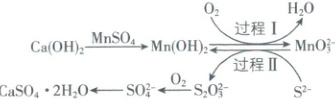 思路导引利用空气催化氧化法除掉电石渣浆[含Ca(OH)₂]上清液中的S²⁻时,往电石渣浆中先加入MnSO₄,生成Mn(OH)₂,再通入氧气发生过程Ⅰ,O₂将Mn(OH)₂氧化生成MnO₂,同时得到H₂O;过程Ⅱ中,MnO₂将S²⁻氧化为S₂O₃²⁻,自身被还原为Mn(OH)₂,S₂O₃²⁻进一步被O₂氧化为SO₄²⁻,SO₄²⁻与溶液中的Ca²⁺结合,从而制得石膏(CaSO₄·2H₂O)。