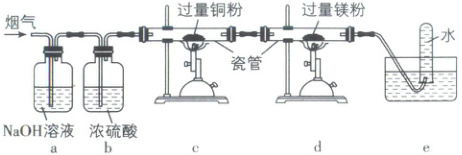 4.C【解析】装置a中是NaOH溶液,空气中的CO₂能与NaOH反应,NO和NO₂也能与NaOH发生反应①、②被吸收,过量的NO与O₂反应生成NO₂后也能被NaOH溶液吸收,A正确;装置c中是过量铜粉,加热条件下,铜能与氧气反应从而吸收氧气,B正确;N₂与镁粉反应被吸收,C正确;装置e中试管收集到的气体主要成分是稀有气体,D错误。