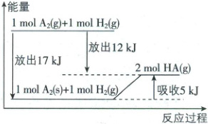 1.D [解析]由题图可知,1mol$\mathrm{A_2(s)}$与1mol$\mathrm{H_2(g)}$反应生成2mol$\mathrm{HA(g)}$,吸收5kJ的能量,则2mol$\mathrm{A_2(s)}$与过量$\mathrm{H_2(g)}$反应生成4mol$\mathrm{HA(g)}$,吸收10kJ的能量,A正确;由题图可知,1mol$\mathrm{A_2(g)}$转化为1mol$\mathrm{A_2(s)}$放出17kJ能量,则1mol$\mathrm{A_2(s)}$转化为1mol$\mathrm{A_2(g)}$需要吸收17kJ的能量,B正确;由题图可知,1mol$\mathrm{A_2(g)}$与1mol$\mathrm{H_2(g)}$反应生成2mol$\mathrm{HA(g)}$,放出12kJ能量,则2mol$\mathrm{HA(g)}$分解生成1mol$\mathrm{A_2(g)}$和1mol$\mathrm{H_2(g)}$时,吸收12kJ的能量,C正确;由题图可知,2mol$\mathrm{HA(g)}$分解生成1mol$\mathrm{A_2(s)}$和1mol$\mathrm{H_2(g)}$,放出5kJ能量,$\mathrm{HA(l)}$转化为$\mathrm{HA(g)}$需要吸热,则2mol$\mathrm{HA(l)}$分解生成1mol$\mathrm{A_2(s)}$和1mol$\mathrm{H_2(g)}$,放出的能量小于5kJ,D错误。