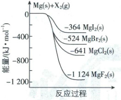 2.C [解析]由题图可知,氯化镁的能量低于镁和氯气的能量之和,则由氯化镁制取镁的过程是吸热过程,A错误;未指明是否为标准状况,反应放出的热量不能确定,B错误;由题图可知,金属镁和卤素单质的能量之和大于生成物的能量,故镁与卤素单质$\mathrm{X_2(g)}$的反应都是放热反应,C正确;物质的键能越大,能量越低,四种卤化镁中$\mathrm{MgF_2(s)}$的能量最低,则$\mathrm{MgF_2(s)}$所含化学键的键能最大,D错误。