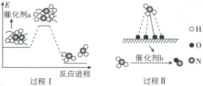 5.B [解析]将游离态N变为化合态N的过程称为氮的固定,过程Ⅰ属于氮的固定,而过程Ⅱ不属于氮的固定,A错误;由图示可知,过程Ⅰ中的生成物总能量小于反应物总能量,反应放出热量,因此总反应为放热反应,B正确;过程Ⅱ中,在催化剂b表面$\mathrm{NH_3}$被氧化的过程中有化学键的断裂与形成,断键吸热,成键放热,故该变化过程中一定伴随能量变化,C错误;在过程Ⅱ中,氨气和氧气反应生成一氧化氮和水,根据得失电子守恒及原子守恒,可知发生反应的化学方程式为$4\mathrm{NH_3}+5\mathrm{O_2}\xlongequal[\triangle]{催化剂}4\mathrm{NO}+6\mathrm{H_2O}$,D错误。