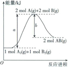 3.A [解析]反应吸、放热与反应条件无关,该反应不一定需要在加热条件下才能进行,A错误;根据图示,反应物的总能量比生成物的总能量低,B正确;根据图示,生成2molAB气体分子吸收$(a - b)\ kJ$能量,则该反应每生成4molAB气体分子吸收$2(a - b)\ kJ$能量,C正确;根据图示,生成2mol$\mathrm{AB(g)}$,破坏反应物中化学键所需的能量为$a\ kJ$,形成生成物中化学键,释放$b\ kJ$能量,破坏反应物中化学键所需的能量高于形成生成物中化学键释放的能量,D正确。