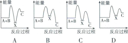 6.A [解析]放热反应的特点是反应物总能量大于生成物总能量;吸热反应的特点是反应物总能量小于生成物总能量。$\mathrm{A+B→C}$是吸热反应,$\mathrm{A+B→X}$是放热反应,$\mathrm{X→C}$是吸热反应,A符合题意;$\mathrm{A+B→C}$是放热反应,$\mathrm{A+B→X}$是吸热反应,$\mathrm{X→C}$是放热反应,B不符合题意;$\mathrm{A+B→C}$是放热反应,$\mathrm{A+B→X}$是吸热反应,$\mathrm{X→C}$是放热反应,C不符合题意;$\mathrm{A+B→X}$是吸热反应,D不符合题意。