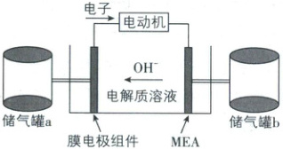 6.C【解析】由题图可知,电子沿导线自左至右移动,电解质溶液中$OH^-$自右至左移动,可推测膜电极为负极,储气罐a中气体为$H_2$,MEA电极为正极,储气罐b中气体为$O_2$。储气罐b盛装的气体为氧气,A正确;纳米材料有较大的比表面积,可增大气体与膜电极接触面积,加快吸收效率,B正确;膜电极为负极,电极反应式为$H_2-2e^-+2OH^-=2H_2O$,C错误;电池总反应为$2H_2+O_2=2H_2O$,一段时间后溶剂水增多,电解质溶液浓度减小,D正确。