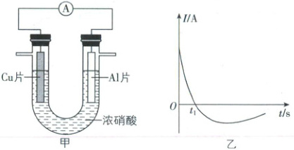 8. 常温下,将除去表面氧化膜的铝、铜片插入浓硝酸中组成原电池(如图甲所示),测得原电池的电流强度(I)随时间(t)的变化如图乙所示,下列说法正确的是(