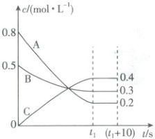 10.C【解析】0~t₁s,A的浓度减小了0.8mol·L⁻¹-0.2mol·L⁻¹=0.6mol·L⁻¹,B的浓度减小了0.5mol·L⁻¹-0.3mol·L⁻¹=0.2mol·L⁻¹,C的浓度增大了0.4mol·L⁻¹,根据各物质浓度变化量之比等于化学计量数之比,可得该反应的化学方程式为3A(g)+B(g)⇌2C(g),A错误;t₁s时,反应达到平衡状态,正、逆反应速率相等且不为0,反应并没有停止,是动态平衡,B错误;恒温恒容条件下充入氩气,使容器压强增大,但是反应物和产物浓度不变,则反应速率不变,C正确;设反应容器容积为VL,由图可知,t₁s时,反应物A的转化率$=\frac{(0.8-0.2)Vmol}{0.8Vmol}×100\%=75\%,$D错误。