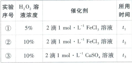 11. [安徽黄山2025高一期中]为了探究外界条件对H₂O₂分解反应速率的影响,某同学分别在三支试管中加入了相同体积的H₂O₂溶液,并测量收集VmL气体所需的时间,实验记录如下: